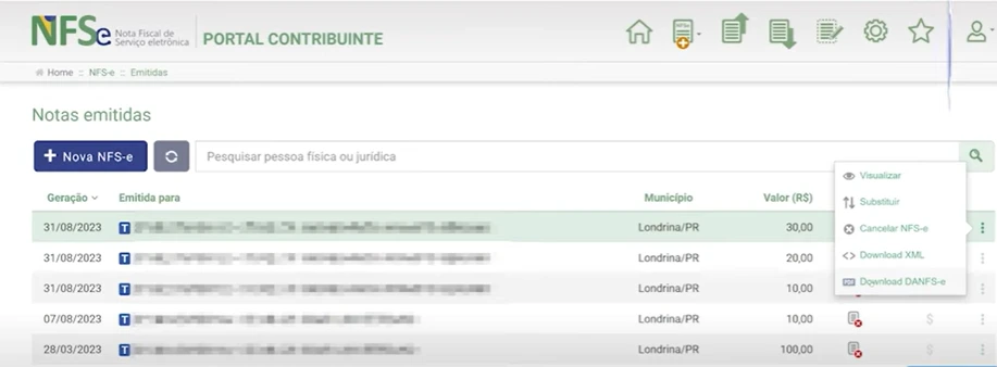 O cancelamento é feito na mesma plataforma de emissão. O usuário deve selecionar a opção notas fiscais emitidas (ícone que tem uma seta apontando para cima). A página mostrará todas as notas ficais emitidas. Depois disso, basta clicar nas três bolinhas ao lado da nota fiscal que deseja cancelar, selecionar “Cancelar NFS-e”.
